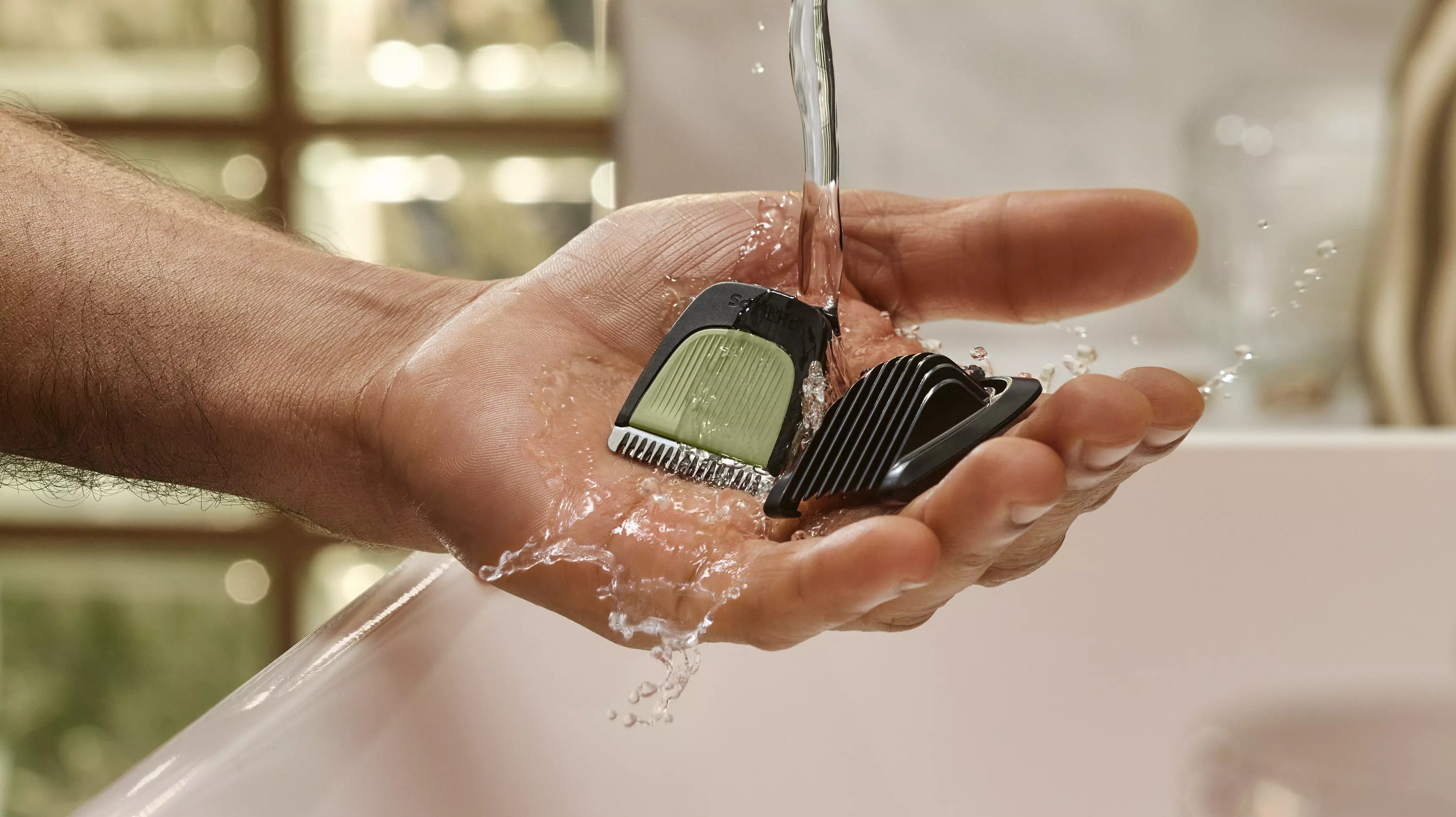 Зніміть насадку з тримера та промийте її під проточною водою для швидкого очищення. Перед повторним встановленням переконайтесь, що вона суха.