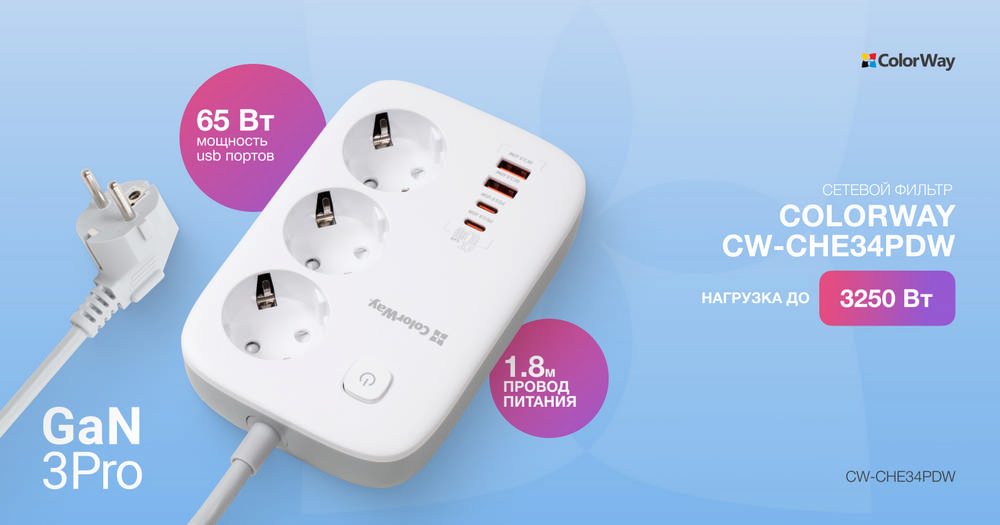 Мощная GaN3 Pro USB зарядка, с максимально гарантированной нагрузкой на все порты 65W, позволяет заряжать несколько устройств одновременно. Провод 1.8 метра из чистой меди выдерживает нагрузку до до 3250 Вт.