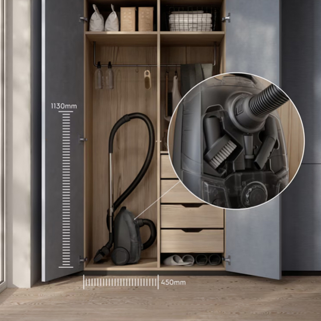 Делайте уборку в два счета с этим легким в использовании пылесосом. Компактный размер делает его уместным для любого дома, а принадлежности, удобно хранящиеся в изделии, позволяют вам иметь прямо под рукой всё, что вам необходимо.