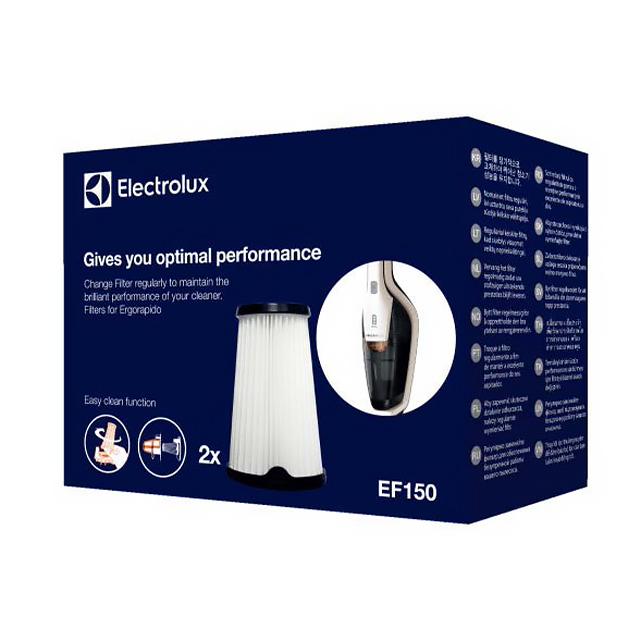 Продлите жизнь вашего пылесоса благодаря использованию оригинальных расходных материалов. Используйте специальный набор фильтров EF150 (pnc 900168374), в который входят два сменных фильтра. Эти расходные материалы надежно прослужат вам от 6 месяцев до года в зависимости от площади вашей квартиры и частоты уборки.