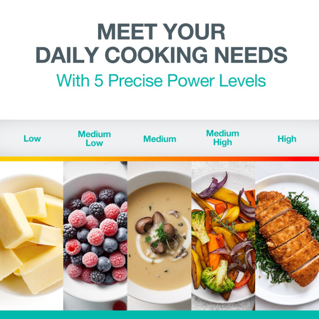 Установите уровень мощности 100 %, 70 %, 50 %, 30 % или 10 %, чтобы отрегулировать процесс приготовления в соответствии с вашими потребностями. Высокая мощность пригодится, когда нужно быстро нагреть что-то, например, при кипячении воды или приготовлении не кремового супа. Средняя мощность позволяет жарить или готовить на пару, а низкая подходит для приготовления крем-супа или для использования прибора в режиме сушилки.