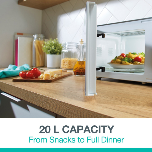 Эта микроволновая печь объемом 20 л позволяет с легкостью готовить все, от быстрых закусок до полноценного семейного ужина. Его просторный интерьер вмещает большие блюда, что дает вам возможность готовить что угодно: от попкорна до сытного жаркого. Независимо от того, разогреваете ли вы остатки пищи или готовите свежую пищу, эта универсальная микроволновая печь станет вашим универсальным спутником на кухне!