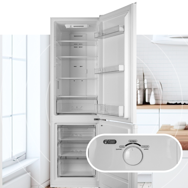 Конструкция холодильника отличается большим полезным объёмом холодильной и морозильной камер. Планируете праздничный ужин? Вы удивитесь, сколько блюд поместится в холодильнике. Хотите заморозить сезонные ягоды? Удобные ящики в морозильной камере для этого и созданы!