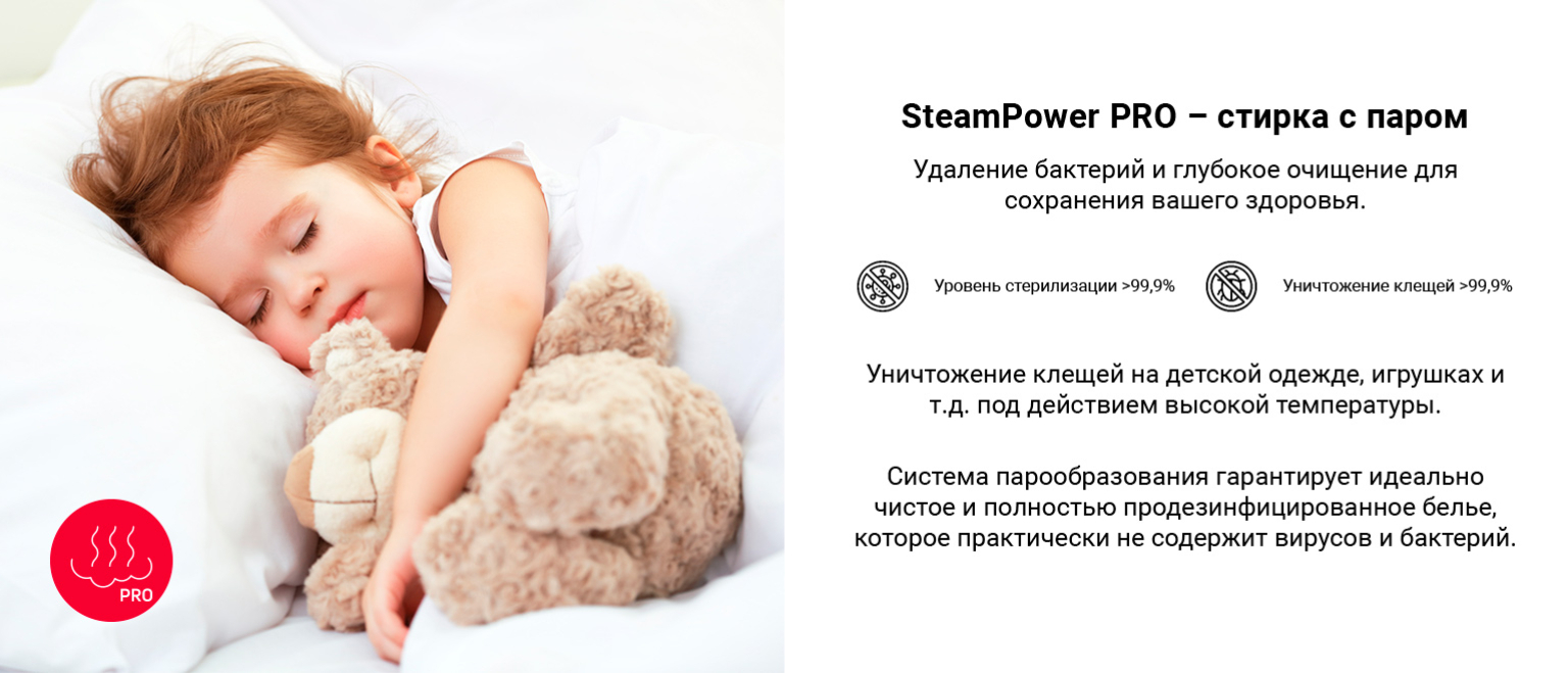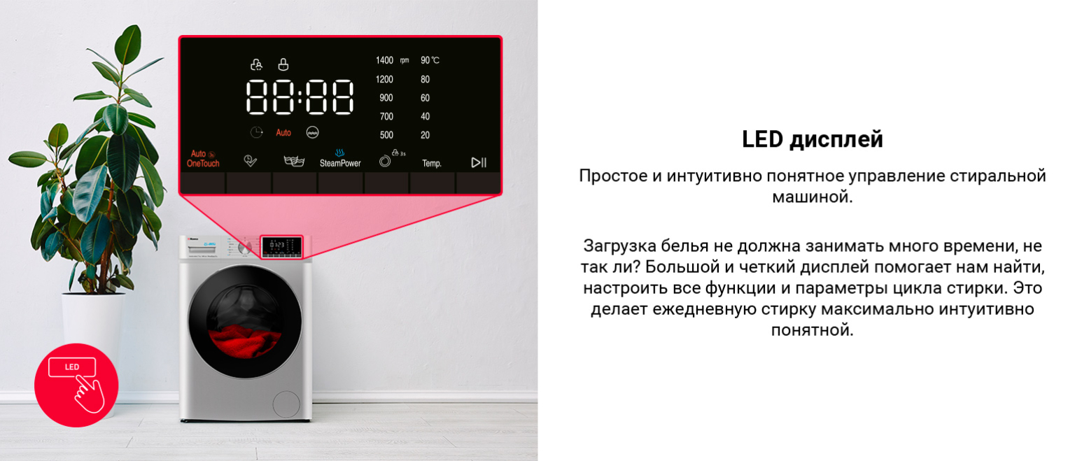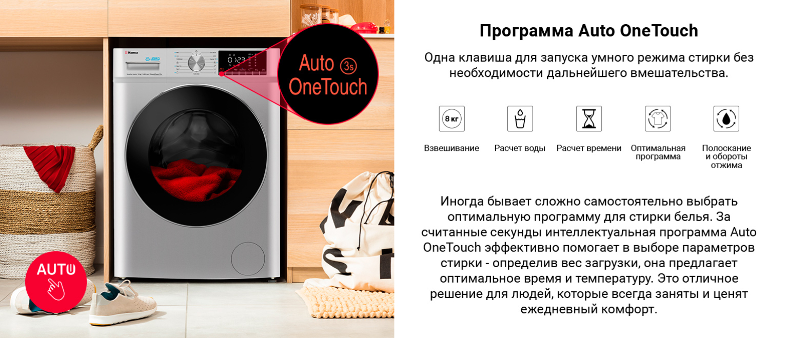 • Функции Программа Auto OneTouch, Готово в … - отсрочка окончания стирки, Дополнительная полоскание, Стирка с паром SteamPower, Регулировка оборотов отжима стирки, Регулировка температуры стирки, Блокировка от детей