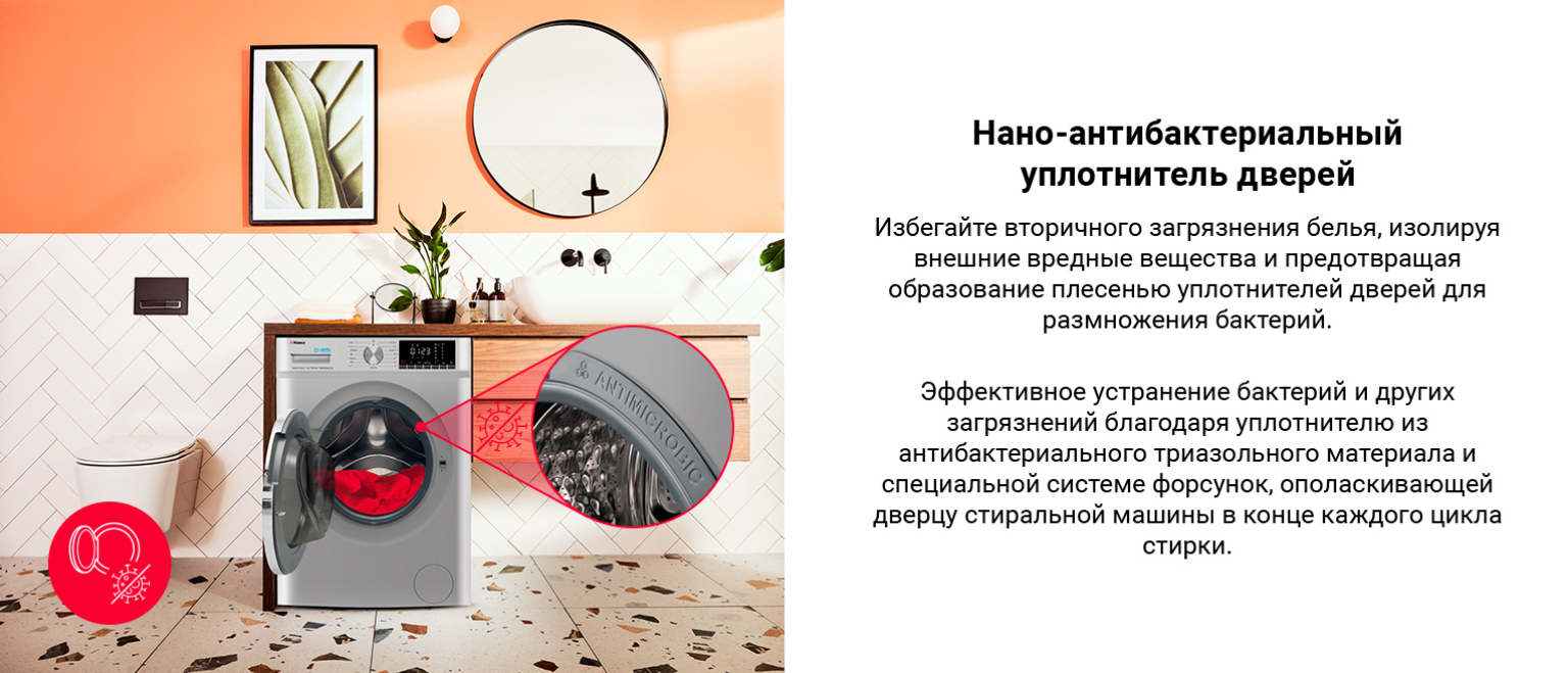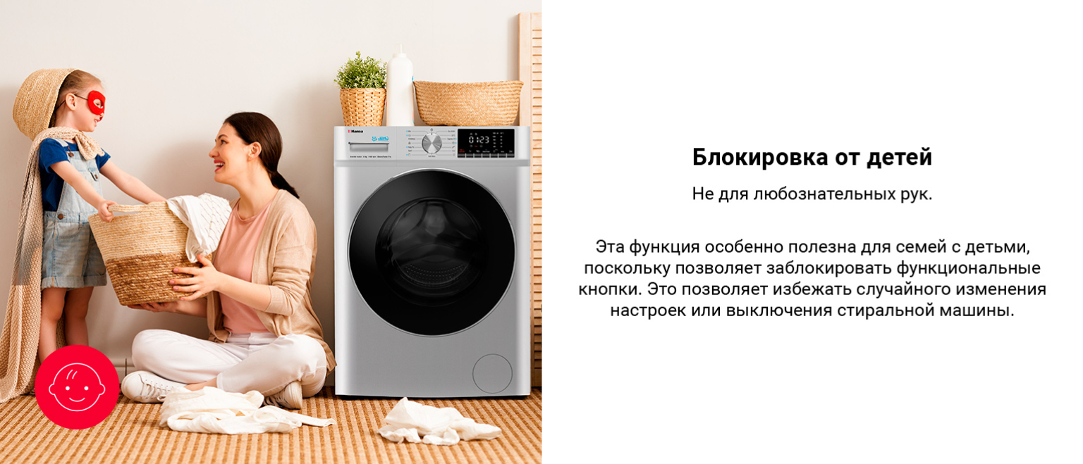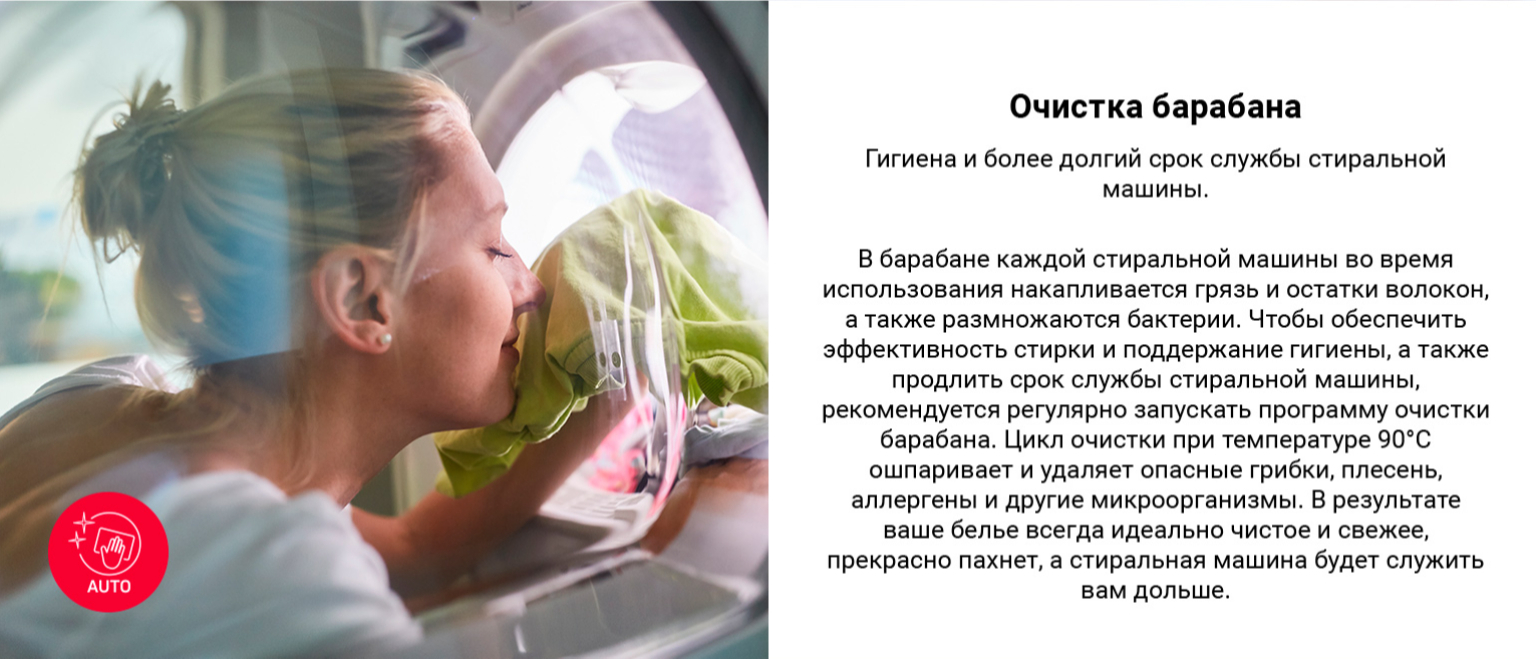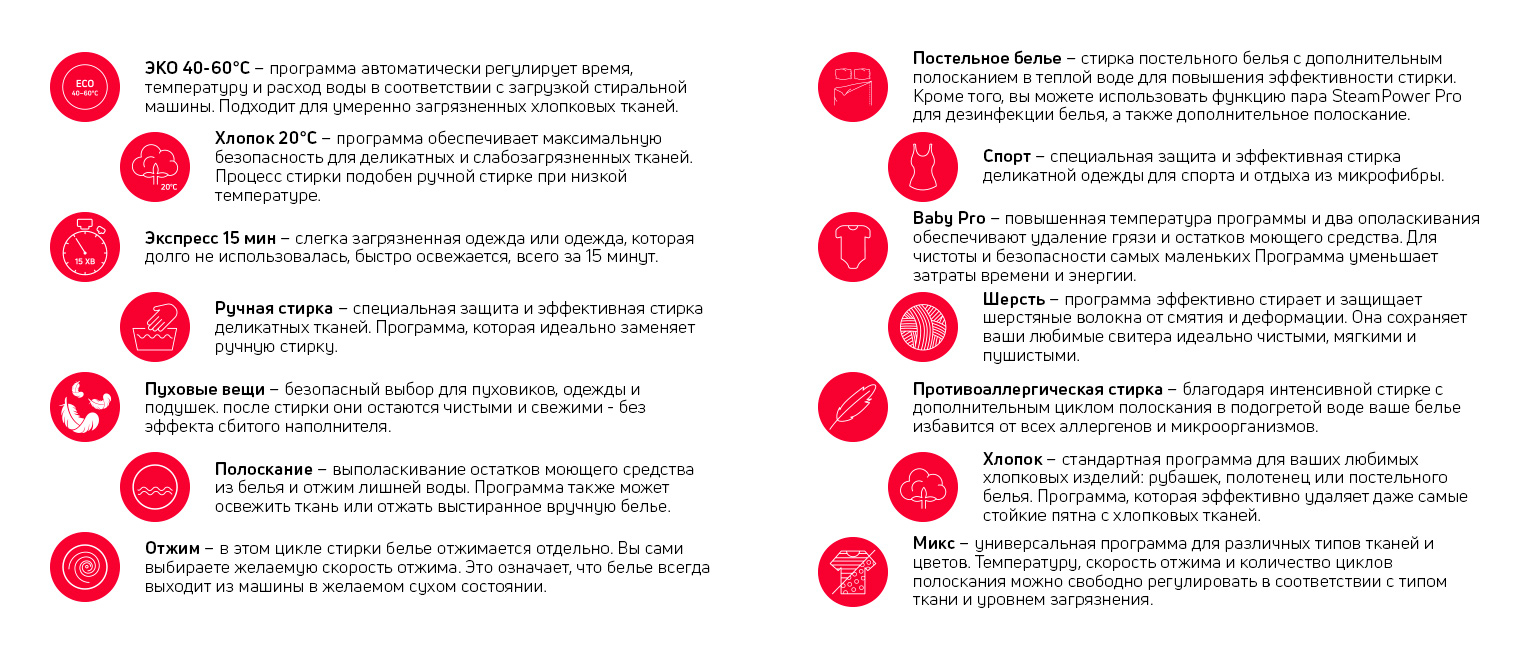 • Программы стирки ЭКО 40-60˚C, Хлопок 20˚C, Экспресс 15 мин, Ручная стирка, Пуховые принадлежности, Полоскание Отжим, Очистка барабана, Постельное белье, Спорт, Baby Pro, Шерсть, Противоаллергическая стирка, Хлопок, Микс