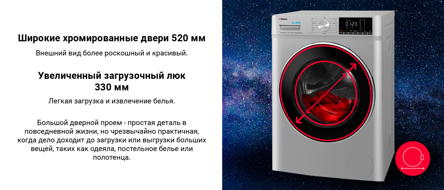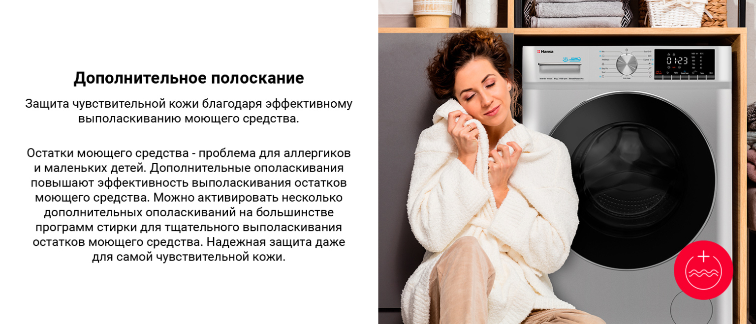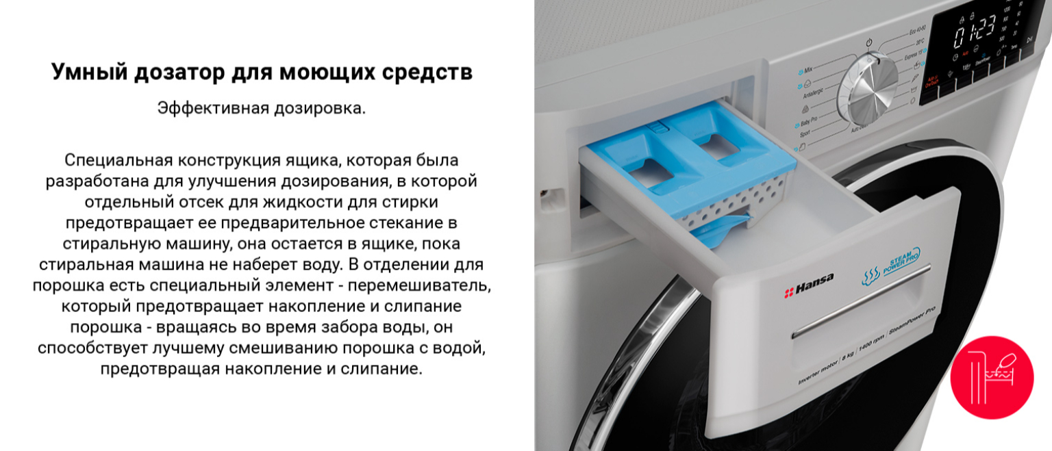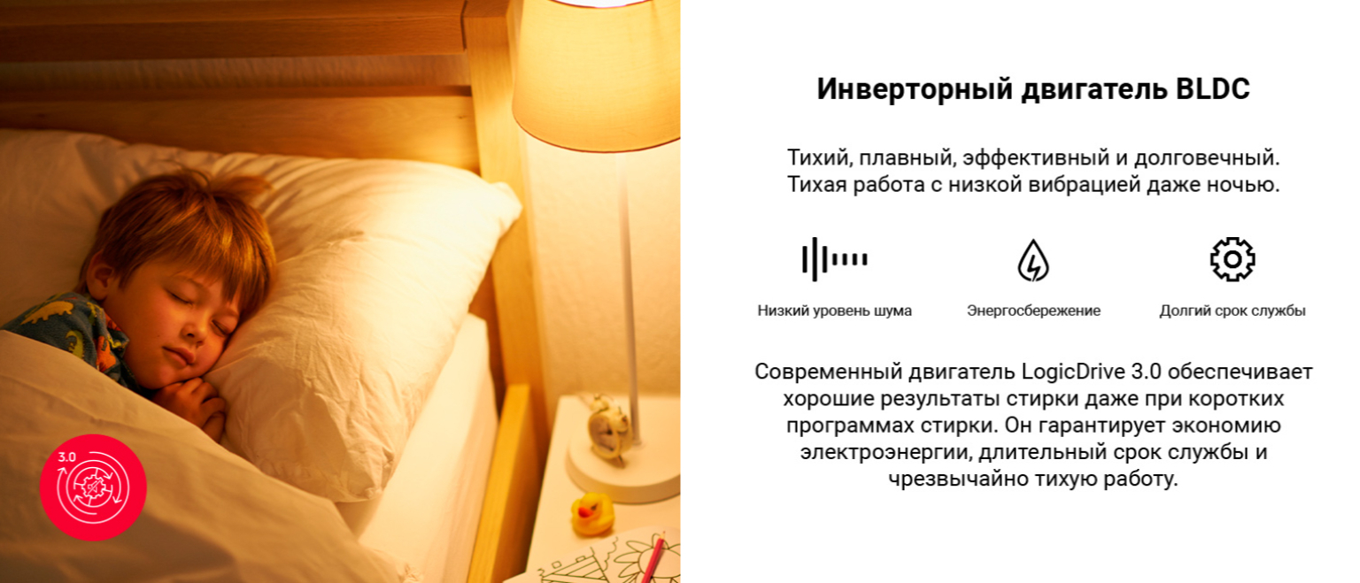 • Программы стирки ЭКО 40-60˚C, Хлопок 20˚C, Экспресс 15 мин, Ручная стирка, Пуховые принадлежности, Полоскание Отжим, Очистка барабана, Постельное белье, Спорт, Baby Pro, Шерсть, Противоаллергическая стирка, Хлопок, Микс