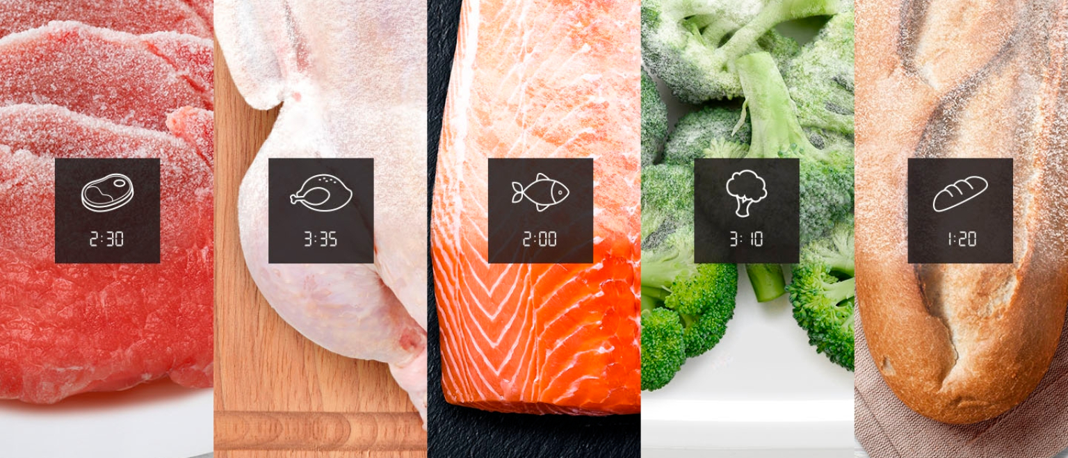 Быстро размораживайте продукты с помощью функции быстрого размораживания. В меню представлены 5 типов наиболее часто используемых продуктов: мясо, птица, рыба, овощи и хлеб. Просто выберите тип и вес продуктов и программа рассчитает оптимальное время размораживания. Таким образом, приготовление ингредиентов занимает меньше времени, сохраняя питательные вещества.