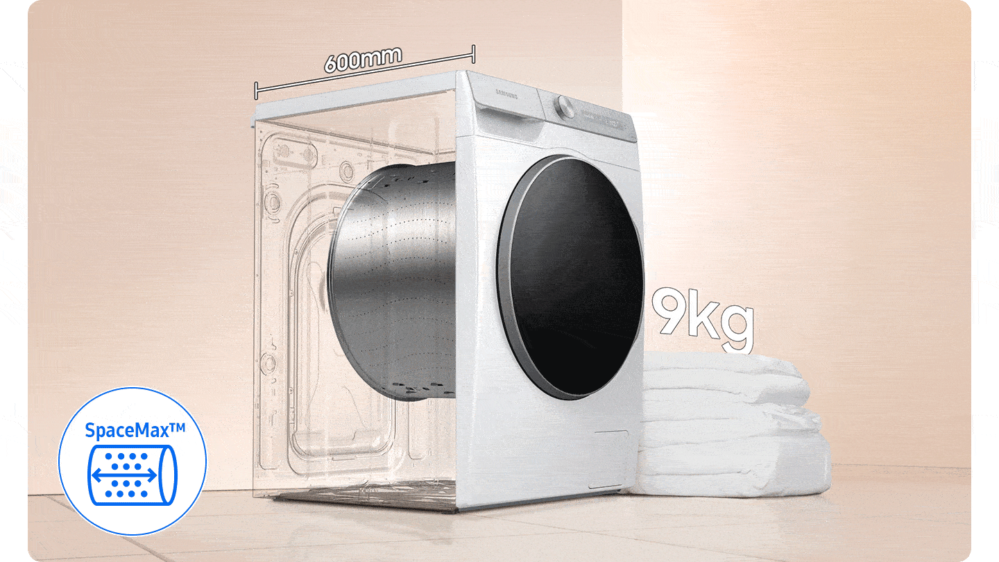 Пральна машина зі стандартною глибиною в 600 мм вміщує в собі 11 кг одягу — все завдяки технології SpaceMax! До того ж вона має мінімалістичний та плоский дизайн, який гармонійно впишеться в будь-який інтер'єр ванної кімнати.