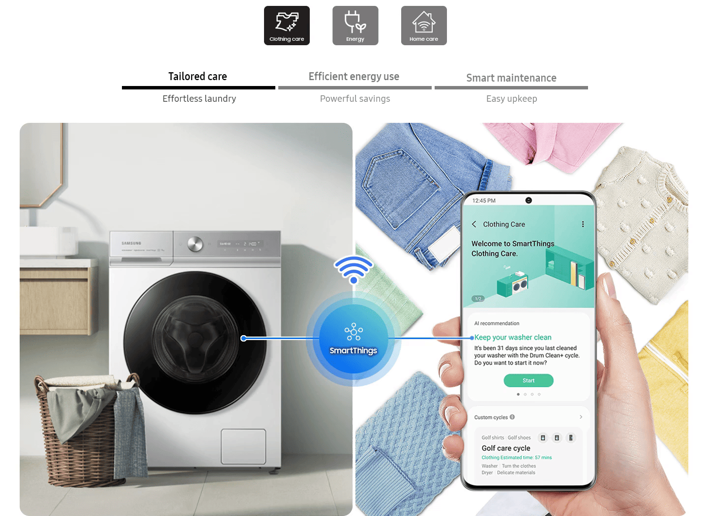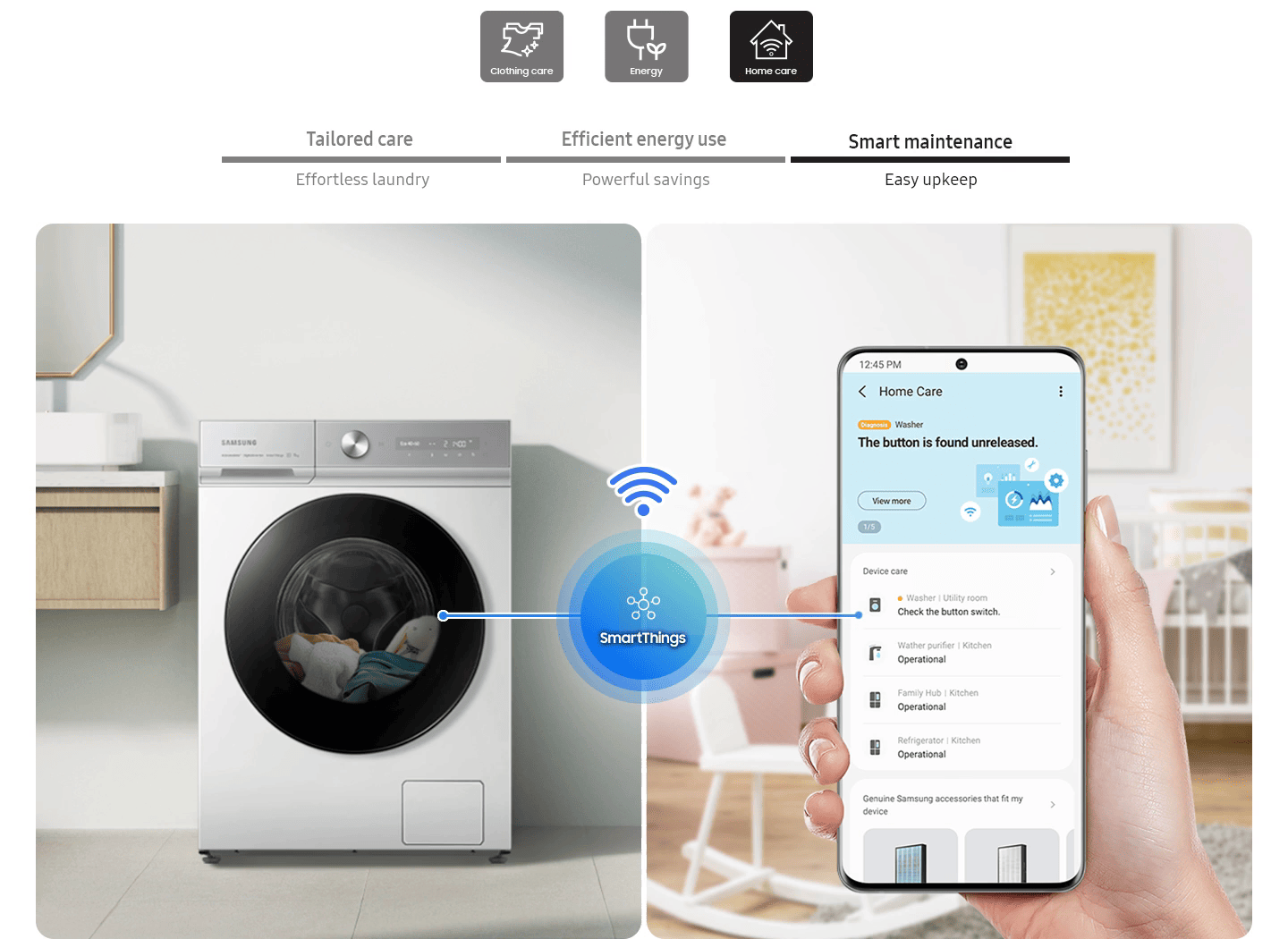 Додаток SmartThings Home — це зручна програма, в якій ви можете керувати безліччю налаштувань. Clothing Care — функція, яка аналізує специфіку прання та надає різні рекомендації. Energy — функція, яка допомагає вам керувати електроенергією, а Home Care — підтримувати машину в стабільному стані.